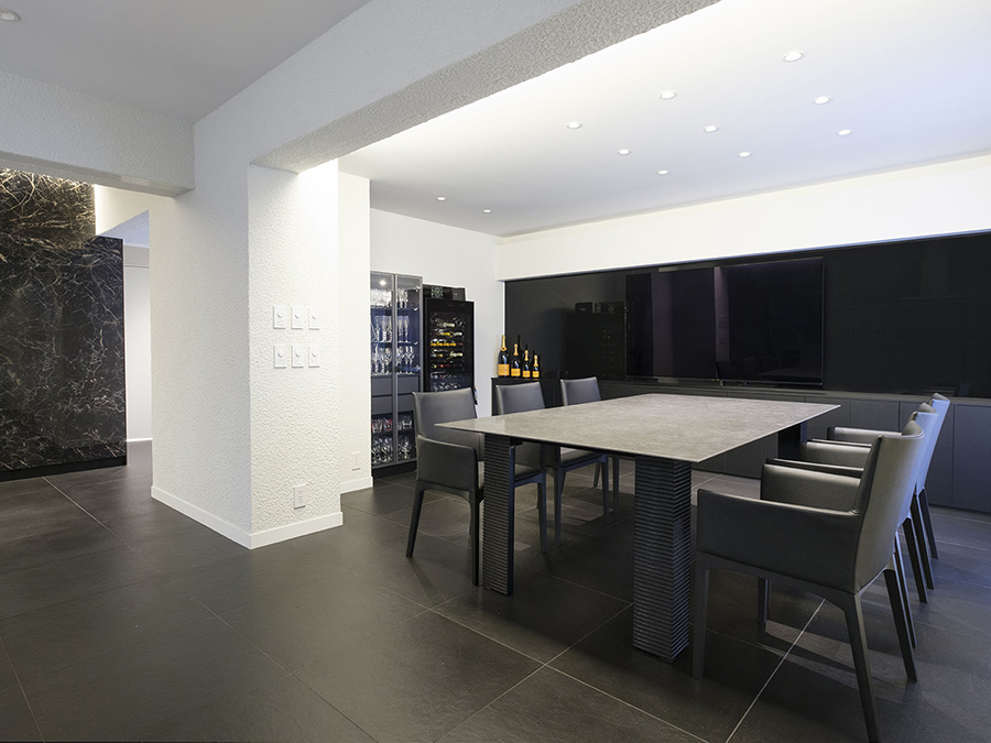 アイランドキッチン・クォーツストーン(Caesarstone5031/W2,550×D140×H850) ダイニングテーブル(メガスラブタイルW2100×D1200) |